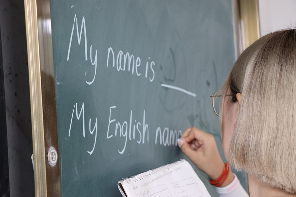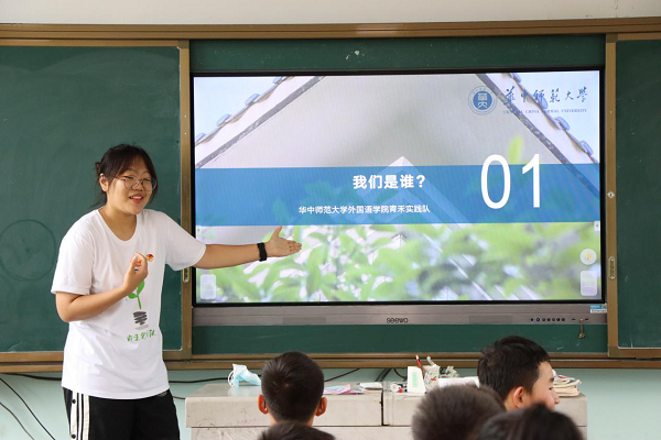 第一节课在同学们的自我介绍中拉开序幕。为尽快拉近师生距离,活跃课堂氛围,青禾实践队队员李怡霖邀请同学们用纸条写下自己的姓名与爱好,并鼓励同学们在课堂上大声分享。热闹的班会环节以华中师范大学校园宣传片收尾,随后,英语会话课如期开课。青禾实践队队员张奕萱以击鼓传花的形式首先破冰——拿到花的同学纷纷站起来用黑板上事先写好的英文句式进行英文自我介绍。