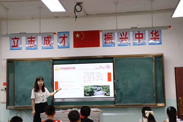队员张奕萱则从“南陈北李”这一历史事件出发,向同学们介绍了陈独秀在“五四”运动中的领导作用及其主编的报刊《新青年》在思想引领方面的重要影响。队员李怡霖和赵郅斐则分别引用毛泽东和恽代英的诗句为学生们描绘了生动立体的革命先辈形象:“孩儿立志出乡关,学不成名誓不还”、“各勉日新志,共证岁寒心”。同学高铭凤在课后感叹道:“我以后也要像他们一样,做为祖国、为人民无私奉献的人。”