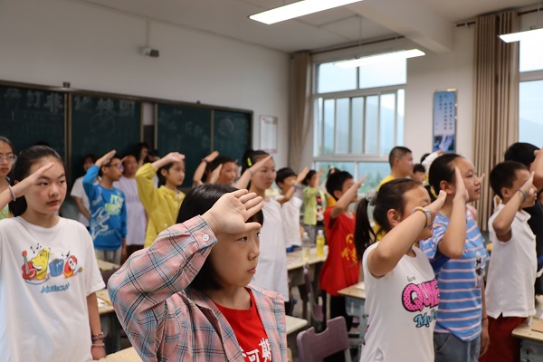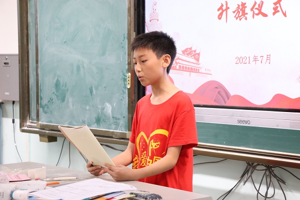 由于暴雨天气影响,原定于室外开展的升旗仪式临时改为室内举行——通过电子大屏,队员们组织学生共同观看了天安门升旗仪式。学生们齐唱国歌,行少先队礼。升旗仪式结束后,由队员焦点进行以“美丽中国,以梦笃行”为主题的演讲。她以“天下兴亡,匹夫有责”为切入点,向学生们强调了爱国对个体及国家的重要性,“作为时代新人,我们应该把爱国作为自己的责任和义务,并用强烈的责任感加以履行。”
