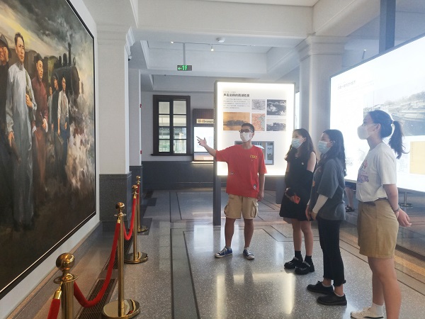 在返回上海之前,薪火实践团上海分队的成员还参观了马家浜文化元素的嘉兴车站南广场和嘉兴车站文化馆。南广场复刻1921年时期的车站站房,并采用南湖湖心泥烧制而成的青砖和红砖,刻印着“建党百年”、“嘉兴1921”、“嘉兴2021”等字样,让人身临其境,仿佛看到南湖的星星火种,燎原中华。嘉兴车站文化馆则展示着嘉兴车站的历史沿革与革命渊源,嘉兴与上海地域相连、人文相融,当中国共产党第一次全国代表大会在上海被迫中断后,负责会务和安保工作的王会悟提议并带领一大代表从上海乘火车转移到嘉兴续会,并庄严宣告党在南湖诞生,红船从浙江起航。
