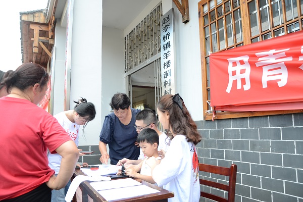 11日上午,实践队队员在羊楼洞村村委会处设置报名点,接收报名家长与学生的报名表。经村干部为此次支教活动做宣传后,陆续有家长携带孩子前来填写报名表。羊楼洞村的爷爷奶奶、爸爸妈妈们对“e启学”的开课充满了热情和期待。原因其一是课堂能免费为孩子们进行课业辅导、素质教育、艺体课程等等,开阔知识视野,促进身心健康,还能与高校的大哥哥大姐姐谈兴趣、聊生活、树理想,对于家长们来说是一件放心且值得的事情。其二则是村里的孩子们在暑期并没有多样的兴趣班可供选择,而家长又忙于工作无法及时看管,大多数孩子就会沉迷于手机电脑,不愿学习荒废作业。