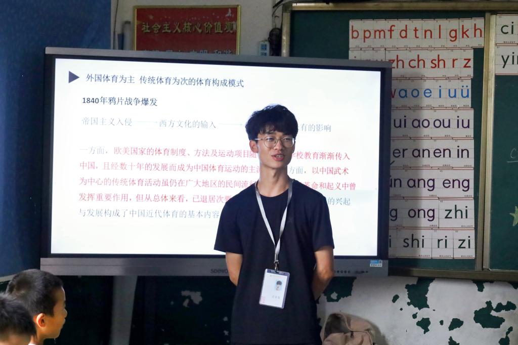 针对乡镇小学历史教育不足的现状,实践队在课程设计中加强了历史教育。队员程宇以以电视剧《小兵张嘎》引入,以七七事变为切入点,深入浅出地讲解了抗日战争史。“玩也要玩个明白”,队员王守龙以全新视角为同学们带来了一堂近代体育史,激发了学生们的历史学习兴趣与运动热情。课后黎薇同学分享道:“老师们讲述的历史非常有趣易懂,让我明白了学习历史的重要性。”
