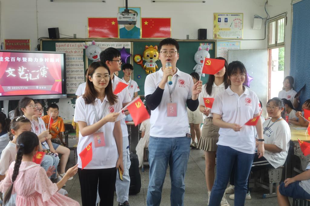 为丰富学生文娱生活,加强与学生的情感交流,实践队举办了一场特殊的“庆建党百年暨助力乡村振兴”文艺汇演。参与表演的不仅有老师,还有主动报名的学生。在前期策划时,实践队将党史故事与乡村振兴事迹融入节目内容,并设计了诗歌朗诵、相声、红歌串烧等多种节目形式。实践队推动学生在欢乐的氛围中收获知识,增长才干,对其进行润物细无声的思想引领与爱国教育。