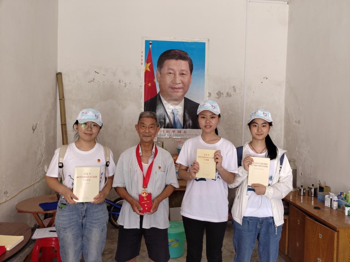 在走访过程中,队员们偶然间走进了一位已有五十余年党龄的老党员家中。老人热情地接待了队员们,随后从屋内拿出了自己正在读的几本书——《论中国共产党历史》、《习近平新时代中国特色社会主义思想学习纲要》……他骄傲地向队员们展示了他的“光荣在党五十年纪念章”,谈起过往经历与如今的幸福生活,他举起了大拇指说:“共产党好啊!”这位农村老党员积极向上的乐观态度、永不停歇的求索精神让实践队成员们为之触动。