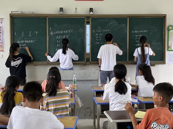 上午,实践队员连馨和李芝澍作为班主任和副班主任早早来到教室带领同学们进行语文早读。为充分调动学生的积极性,连馨安排值日生林雪晴到讲台带领同学们大声朗读。支教队员、数学老师覃伟伦说明同学们课上回答问题积极性不足的问题,提出新兴的激励制度,根据座位将班级分为四个组,回答问题则以小组名义积分,得分最高的组将会在支教结束时得到一份奖励。在积分比拼的激励下,同学们答题热情高涨,出现四位同学同台竞技的景象。
