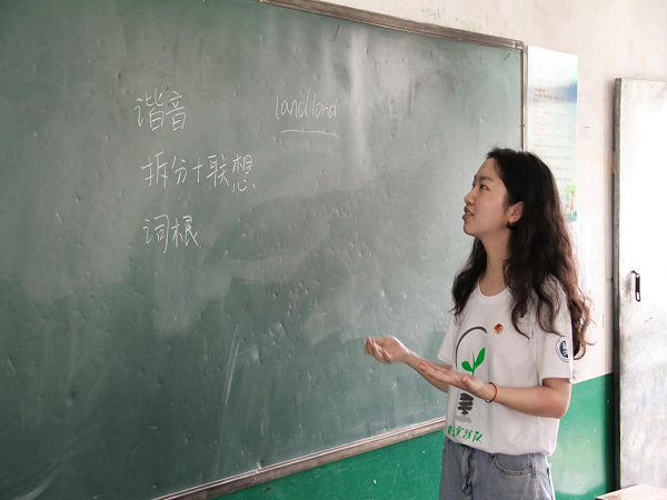 座谈会最后,由实践队队员杨思宇进行模拟试讲,展示外语教学中常用的三大单词记忆法——谐音法、拆分与联想法和词缀法。并最终通过教师点评学生试讲,提高实践队员的英语教学能力。