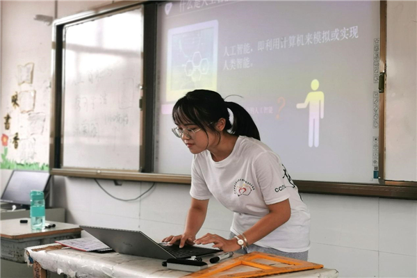 华大青年讯(通讯员 胡晓彤)7月20日下午,博雅·行知支教团开展了第一次人工智能课程的授课,由支教团成员张菊丽进行授课,张菊丽以与学生深度融合的高新技术产品为着力点,重点介绍了人工智能对人类生产与生活产生利好的诸多现实场景。她用通俗易懂的语言帮助学生理解人工智能的发展潜能,旨在激发学生的好奇心和创新思维,敦促学生关注前沿科技发展动态,全面提升学生的信息素养。