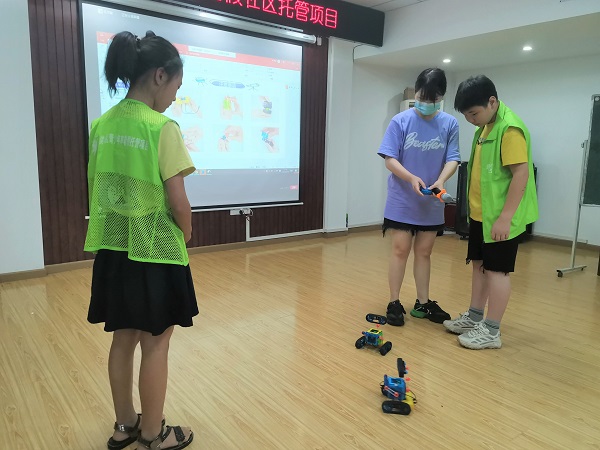 华大青年讯(通讯员 吴文倩)为激发社区内中小学生对机器人编程的兴趣,提高其动手实践能力,丰富暑期生活。7月22日下午,华中师范大学计算机学院创客义教暨党史宣讲暑期实践队前往洪山区葛光青少年空间开展了第18天的机器人编程课活动。该实践活动由华中师范大学计算机学院、“三四三”机器人文化科技公司和华中师范大学机器人协会联合开展。本次课程由“三四三”公司朱海君担任主讲老师,实践队队员吴文倩、白雨欣、边雨璇担任助教。