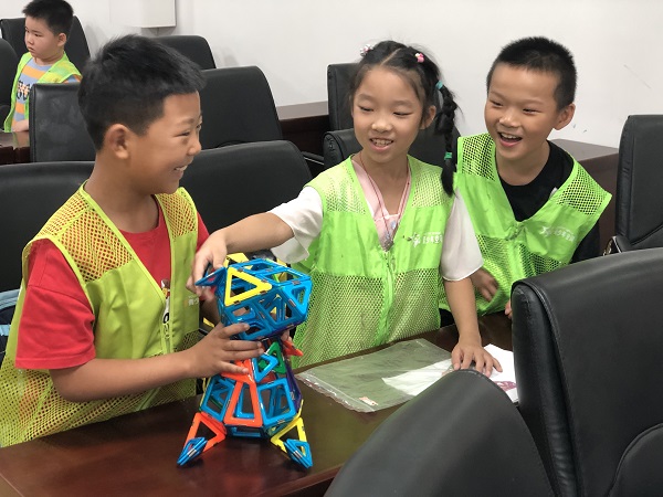 在完成了机器人编程基础内容的介绍后,朱老师开始介绍今日课程的主要内容磁力片编程:每个小组分别按照图纸用磁力片拼搭出如单车、直升飞机等不同的机器人模型。在助教们将拼搭模型所需要的磁力片和图纸分发给各个小组后,学生们便立刻开始分工,并按照图纸进行磁力片的拼搭。当学生们遇到一些困难,如找不到正确的磁力片或拼接错误等,都会与组员认真商讨或举手向老师们寻求帮助。实践队员面对学生们出现的问题,都会上前一一解答,帮助并引导学生们解决问题。由于不同机器人模型拼搭的难度不一,许多较快拼完的小组的学生们也会去帮助其他未完成的小组。最终,所有小组都成功地完成了不同模型的拼搭。队员边雨璇表示:“我觉得今天每个小组都能顺利按时完成任务,很大程度上得益于小组间及成员间的合作与互助。”