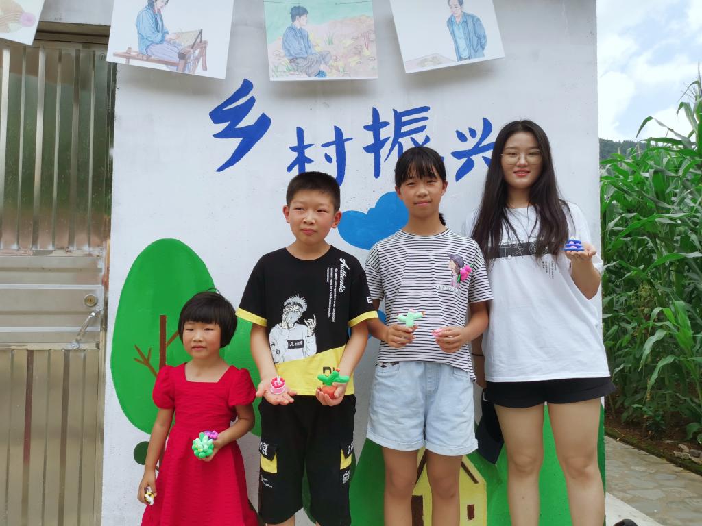 绘制过程中,实践队成员分工明确,相互协作。实践队全体成员一同为水泥墙刷好白漆后,墙绘组同学充分发挥美术专业优势进行绘制,其他小组的成员也从旁协助,从起稿、铺色到最终调整,各个环节都在顺利进行。为保证绘制任务如期完成,墙绘组成员坚持连夜追赶绘制进度。7月17日上午,墙绘工作完成。博雅美行实践队以墙绘为背景,展出了美术学院师生共同创作的党史连环画集《画说百年辉煌》,并设置了粘土艺术课,邀请南河村村民前来参观、体验。