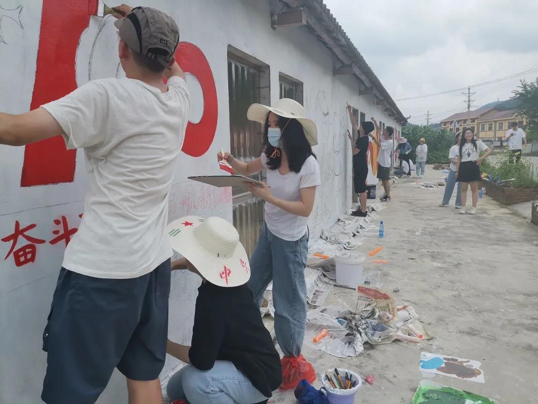 本次墙绘制作共绘制了六面墙面,墙绘组成员从南河村的文化特色和发展特点出发,以建党百年为背景,紧扣乡村振兴的主题,利用面漆、丙烯等工具和绘画、标语等方式装点乡村。通过墙绘展示,将艺术融入乡村生活、将红色元素融入乡风文明,在美化乡村街道环境的同时,为当地乡村建设中融入艺术的创造灵感,以乡村旅游为突破口,拓展艺术体验、艺术展演、艺术培训以及艺术养生等多种经济发展产业链,为乡村经济发展提供了更多路径。