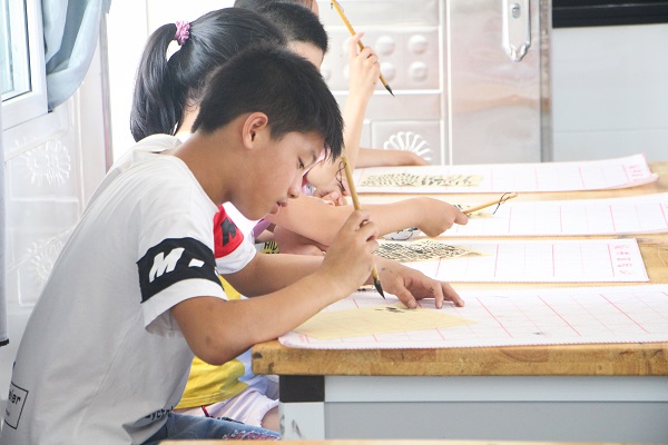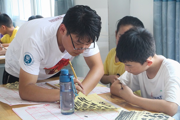 书画同源,良好的书写基础与学习绘画相得益彰。牛士瑜用三节课带领学生练习线条和书法中的常用笔画与结构,穿插讲述为人做事的道理。他强调书法结构注重“左右揖让”“动静相依”,以此启发学生团结友爱,互相体谅,并从执笔书写时的“收放自如”对同学们提出要求,希望同学们能“有所为、有所不为”,坚守初心,不忘来处。