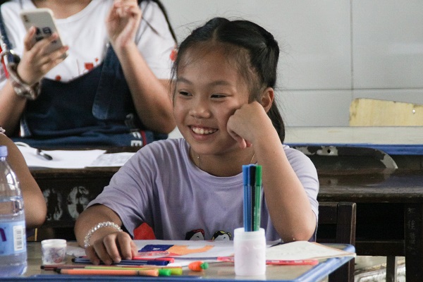 城市与环境科学学院的庄婕则从小朋友们感兴趣的动物和植物入手,讲解简笔画的作画流程和作画技巧。从桃花、荷花到小猫、兔子,庄婕在黑板上进行示范,然后走下讲台指导学生的绘画作品。“我希望他们在长大后回首童年,记忆中可以浮现出某个夏日的午后,我们共绘一个美好的梦。”庄婕在课后总结自己的课程设计思路,“增加儿童美育课程,引导坚定理想信念,这是我的初衷,也将成为我未来的职业理想。”