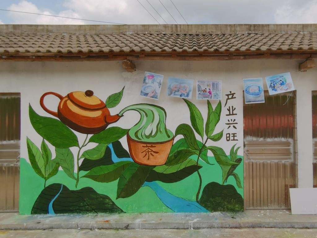 据介绍,本次实践活动以墙体绘画的形式,对标乡村发展需求,用艺术改善村庄环境,加强村民精神文明建设。从7月16日起,实践队员们用自己手中的画笔在墙体.上描绘出以建党百年,绿水青山,乡村振兴,当地的茶文化等主题的特色墙绘。即使墙绘工作量巨大,但队员们无惧烈日,无视深夜,日均绘画11小时,用各自独特的风格创作美术作品,以助力美丽乡村建设,为乡村经济发展提供了更多路径。
