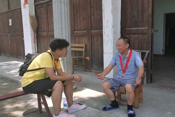 下午,实践队队员们前往陈家湾入户访谈。在访谈过程中,实践队员采访到一位党龄58年的老党员瞿定训。经过初步了解,瞿定训曾经参加过援越抗美战争,在越南国家深受帝国主义侵略的时候,他积极响应国家号召,前往战争一线,保卫国家安全。