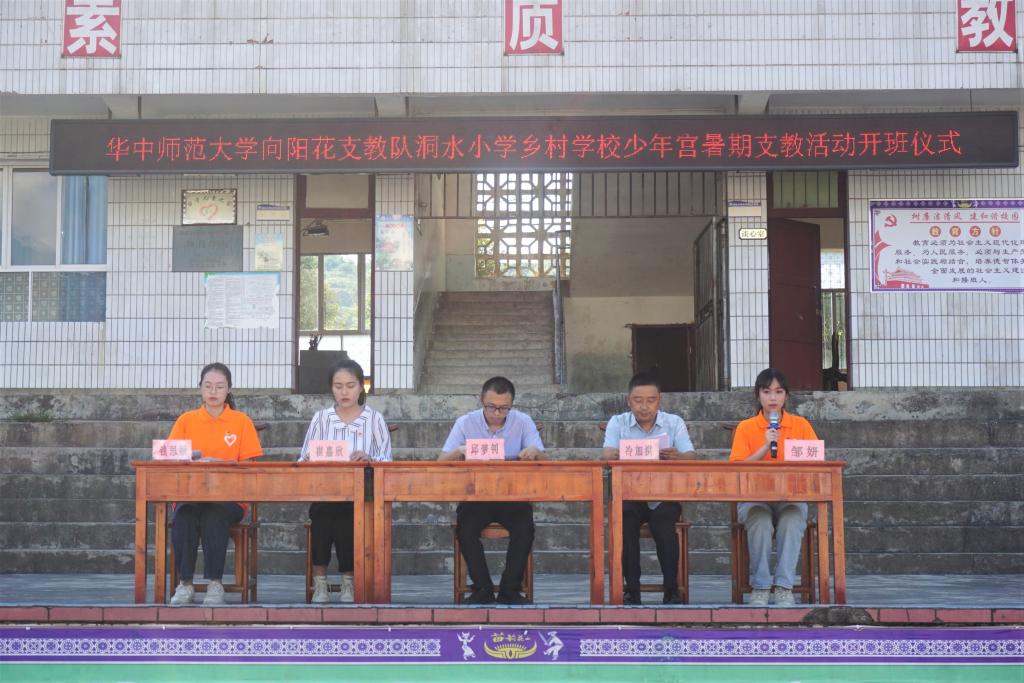 冷加洪在发言中对华中师范大学向阳花暑期实践支教队的到来表示感谢,对洞水小学的基本情况进行了介绍,同时,对本校学生在活动期间的学习、纪律、安全等问题提出了规范要求,并鼓励孩子们努力学习,将来考入华中师范大学,延续红色教育事业。邱梦钊代表乡党委和政府向华中师范大学全体师生表示感谢,对余庆县花山乡的自然环境及人文特征进行了简要的介绍,希望能将此次支教活动打造成为乡村学校少年宫暑期活动的精品典型,更好帮助花山乡中小学生度过安全愉快的假期。