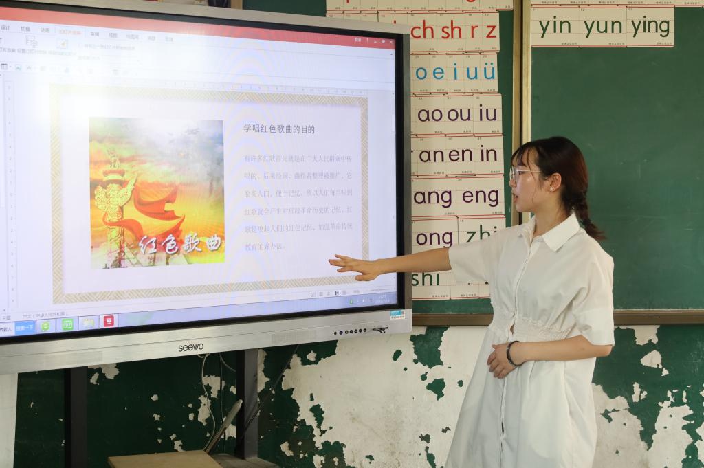 发扬红色精神,延续精神血脉。实践队员将党史教育融入到支教活动中,希望在小朋友们的心中埋藏下一颗红色的种子。“跟着毛主席跟着党,闪闪的红星传万代”,队员全楚云为同学们带来一堂别开生面的党史音乐党课。本次党课创新“党史+红歌”学习形式,重点学唱《红星闪闪》歌曲,学习《红星闪闪》创作背景、人物故事和革命精神,引领学生在唱红歌中学党史、强精神,鼓励大家从百年党史汲取奋进力量,在自己的长征路上唱响青春之歌,在实践中深入党史学习。课后王俊琪同学表示:“忘记历史就意味着背叛,我们要努力学习,为实现中华民族伟大复兴贡献出自己的力量。”