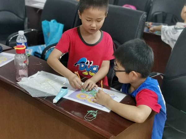 本次课程以3D打印笔为主题,如以往其他机器人编程课一样,主讲老师首先进行了情景引入,充分吸引学生兴趣,并在问答互动中让学生了解机器人编程的一些基础知识。在介绍完理论知识后,老师便把时间交给学生让其动手实践。通过理论与实践的结合,学生能够更加全面地认识机器人编程。同时,课程还注重培养学生团结协作能力。在实践环节中进行小组比拼,在合作中实现效率最大化。助教老师协助主讲老师维持课堂秩序,当学生遇到例如不知如何使用打印笔、材料不够等问题时,积极上前给予帮助,并鼓励碰到挫折的学生再次尝试。在今天的课程中,大多数学生通过积极合作与询问探讨,成功运用3D打印笔绘制出了“眼镜”。