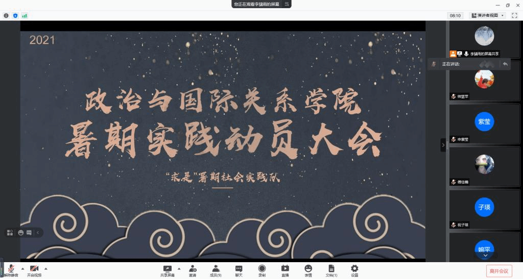 华大青年讯(通讯员 帅慧苹)胸怀千秋伟业,恰是百年风华。时值建党一百周年,为汲取百年党史中形成的优良传统和精神力量,激发新时代奋斗前行的精神动力,华中师范大学政治与国际关系学院求是暑期社会实践队(以下简称“求是”暑期社会实践队)开展了“传承红色基因,赓续精神血脉”中国共产党精神谱系党史学习暨系列宣讲社会实践活动。7月28日上午,“求是”暑期社会实践队在腾讯会议线上召开动员大会。本次会议由负责人李骕雨主持,全体队员参加。