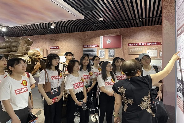 在鄂豫皖红军发展史陈列馆内,由麻城市红色文化研究会会长李敏负责为宣讲团进行讲解。李敏讲述了上个世纪鄂豫皖三省红军是如何充分发挥游击战术给予敌人沉重打击的,以及大别山红军“听党指挥、心系百姓、排难创新、不胜不休”的精神。在这种精神的影响下,大别山军与民“心手相连,血乳交融”,书写了“家家有红军,村村有烈士,山山埋忠魂,岭岭书丰碑”的壮阔奋斗史。李敏对“光未然”文化自信宣讲团的同学们寄予厚望。她强调,大别山民众一直以来都是红色精神的坚定支持者与传承者,在革命战争年代,民众虽然文化水平落后,但始终无私地支持着红军活动。新时代青年更应坚守大别山红色精神,从大别山精神中汲取力量,从内心世界、灵魂深处自觉做共产主义远大理想和中国特色社会主义共同理想的坚定信仰者、忠实践行者。