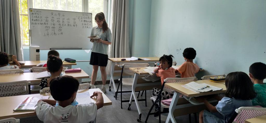 课程伊始,刘梦滢先是举出课文《黄山奇石》中的一些重难点生字,带领8位学生朗读、组词、造句,以来增强他们对课文文本中字词的记忆。她还在课堂上开展了开火车游戏,让学生接力朗读《黄山奇石》。通过这种方式,教师能更好地了解学生对课堂前半部分字词的掌握情况,并及时进行针对性指导。在课文教授完毕后,孩子们的普通话发音、声调、语气及词句的连贯都有了喜人的进步。
