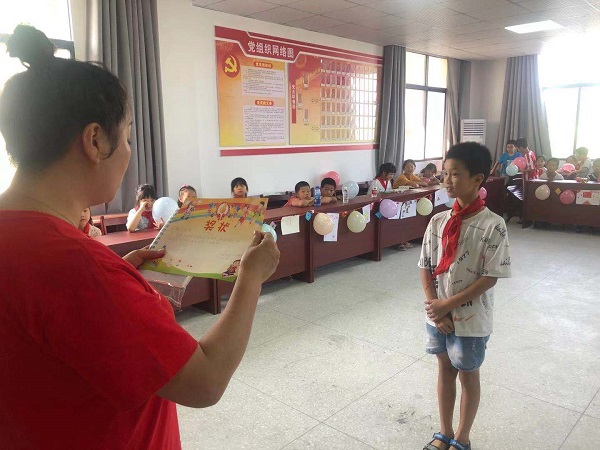 大会伊始,奏中华人民共和国国歌,全体起立高唱国歌行注目礼。奏毕,优秀学员颁奖典礼开始。针对学员在课堂上的表现,分别设置了“学习积极分子”“活动积极分子”等十余项荣誉称号。由汪中水和金子易为同学们颁奖,获奖学生手握奖品与证书合影留念。在颁奖典礼后,金龙村党委书记汪中水发表相关讲话,他回顾了历时半个月的支教过程,表达了对支教老师工作的肯定和感谢,并且对于未来的支教合作抱有的极高期望。