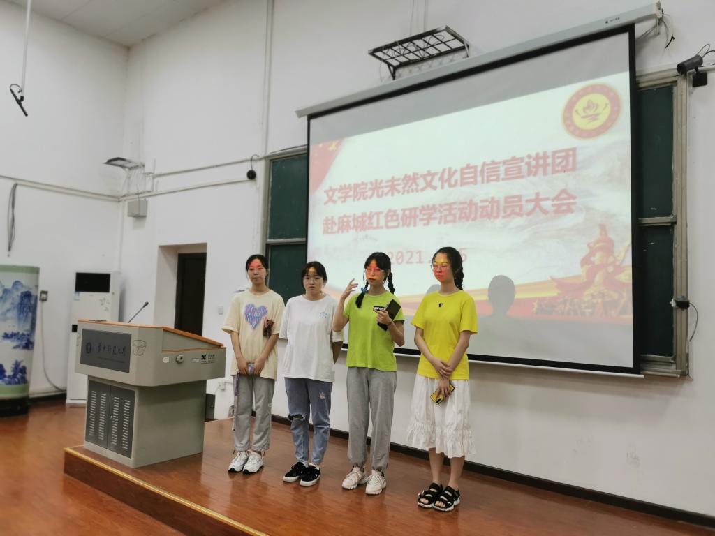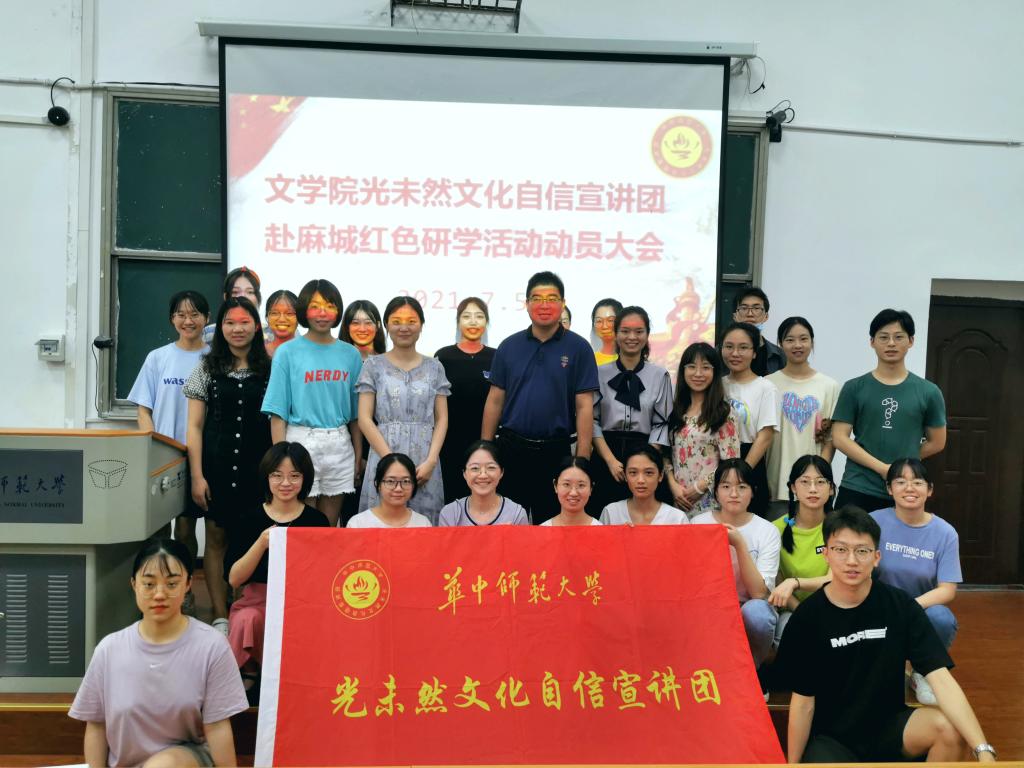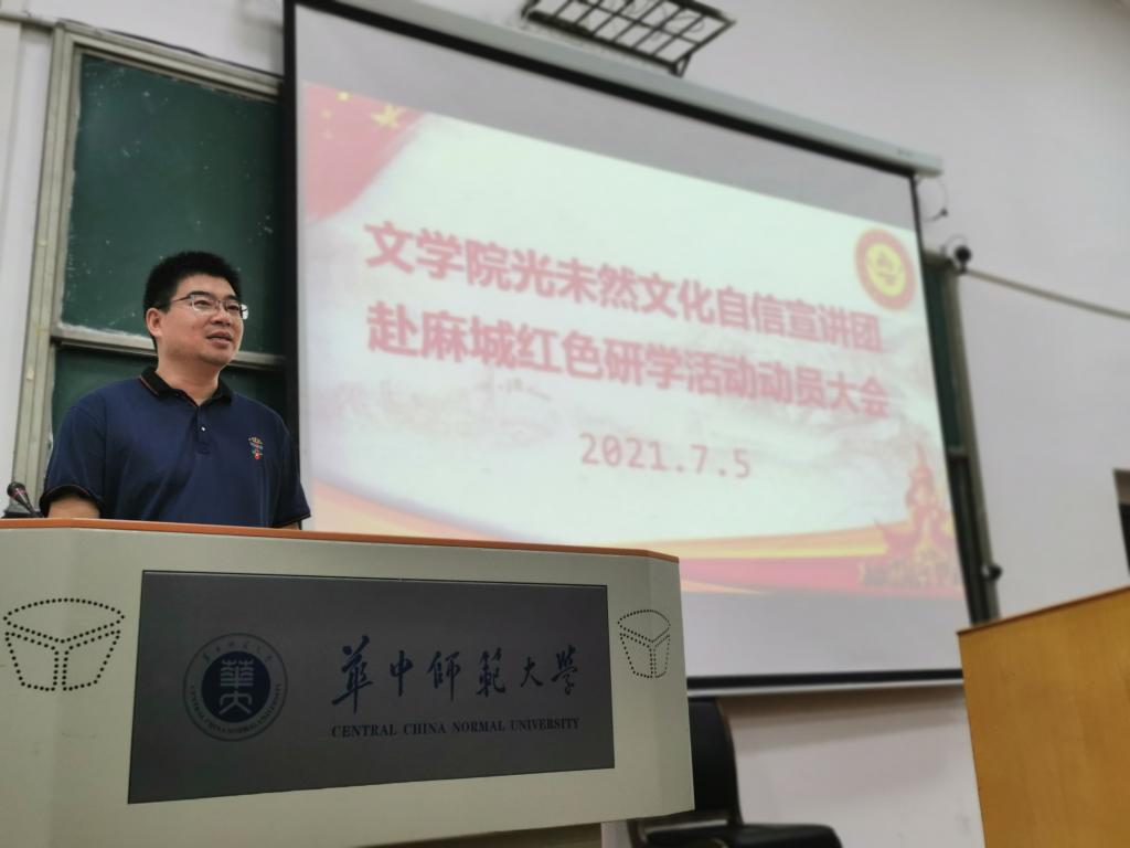 华大青年讯(通讯员 喻腾玉)2021年7月7日下午,文学院“光未然”文化自信宣讲团赴麻城红色研学活动动员大会在文学院2201教室顺利举行。本次动员大会由文学院团委副书记陈若千主持,文学院党委副书记徐福刚,文学院团委书记李哲立,团委副书记鲍思琦出席动员大会。