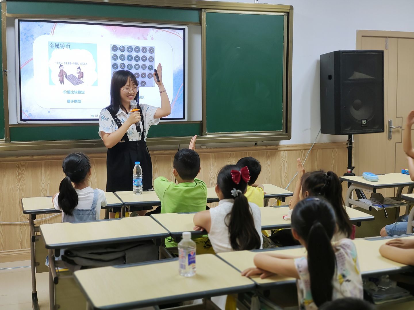 “金蕊”活动主要由知识讲解与趣味游戏两个环节构成。队员们首先向小朋友们展示几种常见纸币,随后以提问引导的方式向小朋友们讲述货币的演变过程——从贝壳到金银、铜钱再到纸币和现在的电子支付,并总结了各类货币形态的优缺点。如今,电子支付发展迅速,纸币的地位逐渐被削弱,儿童对纸币知之甚少。队员们以此为切入点,着重阐述了纸币的重要性及其社会意义。知识讲解环节结束后,队员们还不忘认真地带领小朋友们回顾本次课程所学,以加深他们的印象,帮助他们更好地消化财商知识。在整个过程中,队员们耐心讲解,小朋友们踊跃答问,课堂气氛融洽。