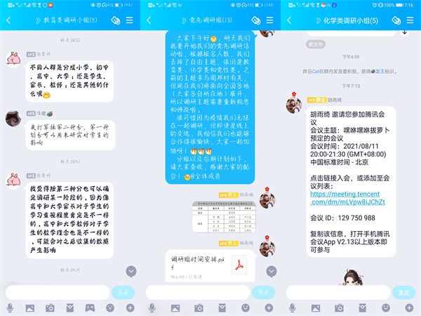 调研组成员通过群电话、腾讯会议等交流工具进行线上的语音沟通,最大程度上削弱非面对面交流对团队沟通产生的障碍。最终以党史学习、线上教学、塑料化学等三大主题分别开展,以调研队员所在地区为主要调查区域,采取线上线下相结合的方式,将调研工作真正的落实、落稳。