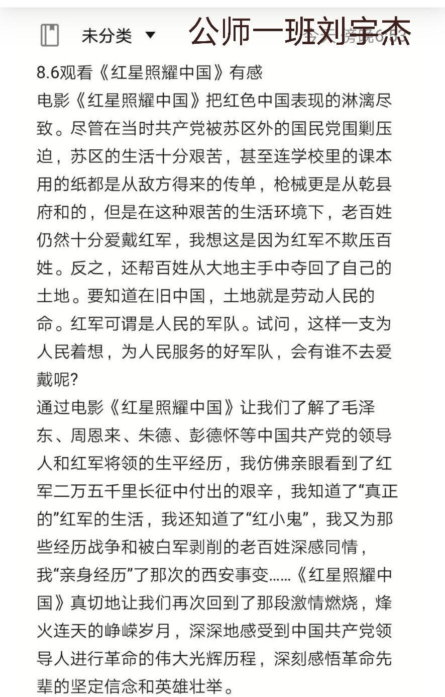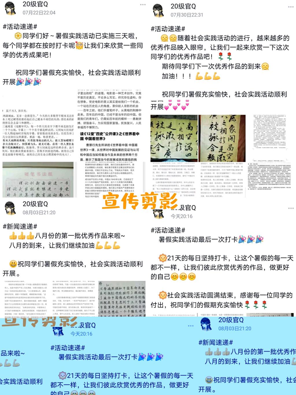 打卡内容以“四史”教育、习近平新时代中国特色社会主义为主要主题,同学们围绕主题进行学习,定时打卡,产生了许多优秀作品,例如读书心得、观影影评、书法作品、摄影作品等等。各班学习委员和年级学习部长每三天挑选出部分优秀作品,由20级年级官方QQ定期推送。8月9日,本次社会实践活动圆满完成。年级官方QQ累计推送7次,共推送70篇优秀作品。