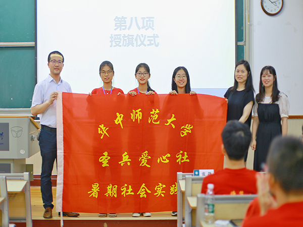 随后,两支下乡队伍——玉溪队与松阳队的带队老师分别结合自身下乡与支教经历,对队员们就安全与纪律问题提出了嘱托和寄语。爱心之旅总负责之一、暑期社会实践队学生代表何泽玲发言,并带领全体队员进行宣誓仪式。紧接着由涂敏和谢先军一同为实践队授旗。