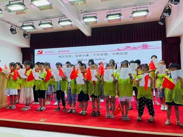 在小组比拼结束之后,大集南湖社区青少年空间的所有同学一起朗诵了诗歌《可爱的中国》,表达出了对祖国母亲的热爱和对党的感激之情,赢得了在座所有老师与家长的掌声。