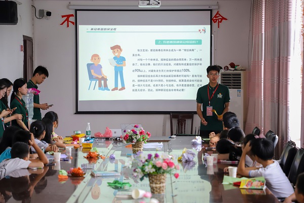 经过前期走访调查,实践队发现月池村留守儿童们对疫情防护知识了解有限。为了增强孩子们的防疫意识,实践队队员们首先为大家科普了新冠疫情的传播途径、发病症状等基础知识,教导大家如何正确佩戴口罩等一系列防疫有效措施,以加强个人防护。实践队队长田超表示:“当下,尽管新冠肺炎疫苗已经问世,病毒传播速度放缓,但抗疫战争还没有结束,疫情仍然在人群之中肆虐。此时,儿童的防疫知识教育显得尤为重要。”