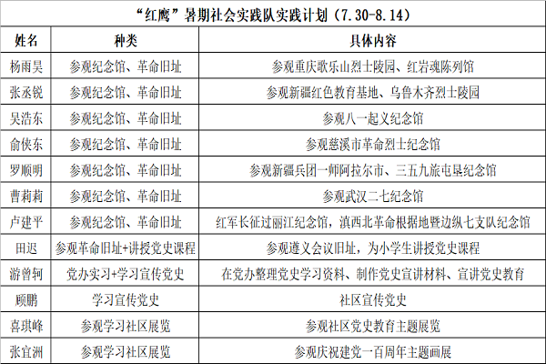 大会伊始,杨雨昊致开场词,并对本次暑期社会实践的计划进行大致的介绍。作为政国院的一支分队,“红鹰”暑期社会实践队将在15天的时间里,采取线上+线下结合的形式进行此次社会实践。各队员结合自身实际情况,围绕“学习党史”的主题,开展相关线下实践活动,自行学习党史,记录学习经历,总结个人感悟。并在实践结束后利用互联网在线上与其他成员分享,以达到互相学习交流,开阔学习视野的目的。线下实践内容具体内容包括参观纪念馆和革命旧址、参观党史教育主题展览、宣讲党史有关知识以及党办实习等。