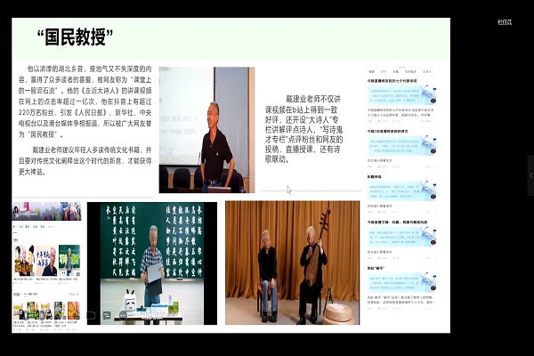 接下来,杜佳苡向团队成员介绍了“网红大V”戴建业。不拘泥于传统教学方式的戴建业在网络上开通了自己的个人账号,以新兴媒介传播中华传统文化知识,并用自己独特的讲述方式赢得了众多读者的喜爱,并且因他和蔼可亲的风格获得了“国民教授”的称号。杜佳苡评价道:“戴教授以语言构建了一个现代人与古代诗人之间的共享时空,他为我们展现了身为教师如何向众人普及中华文化。他为保护传承中华文化所展现出的不屈不挠地精神,是我们华师精神的又一体现。”