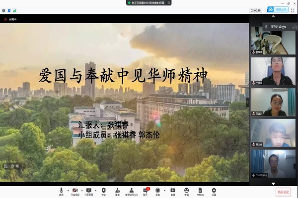 华大青年讯(通讯员 张祺睿)8月15日晚,为了解华师故事,学习华师前辈的精神,华中师范大学计算机学院校史故事寻访团开展以“讲华师故事 学先辈精神”为主题的“校史故事寻访”活动线上会议。本次会议由张祺睿、关君铭、杜佳苡等人进行分享,其他成员旁听并参与讨论。