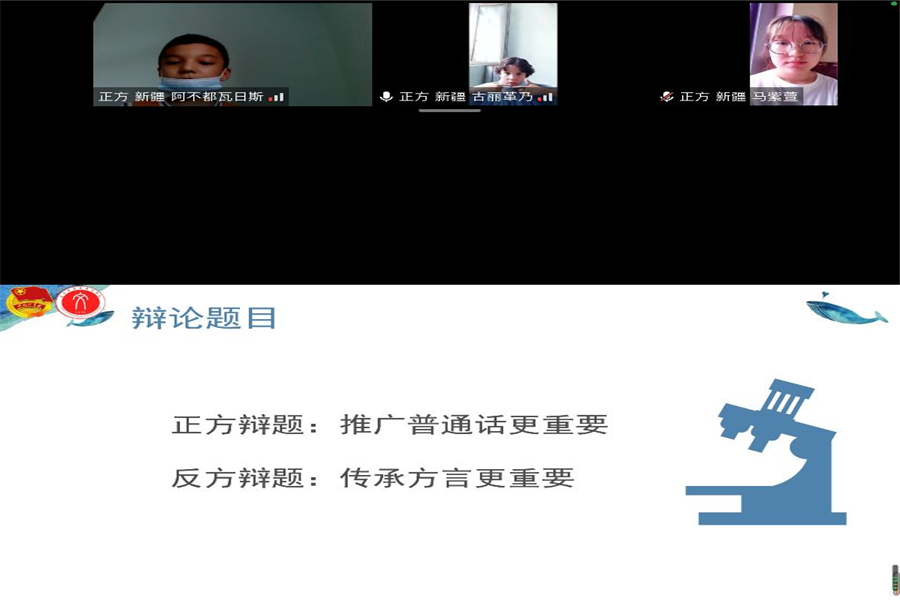 比赛伊始,正反方辩手依次进行了己方观点的陈述,开宗明义。来自黑龙江的小学生付佳航担任正方一辩。他认为,推广普通话是大势所趋,掌握普通话,走遍中国都不怕;反方一辩马紫萱则对传承方言更重要这一点发表了自己的观点,并联系生活实际进行论证。辩论赛进入到自由辩论环节时,同学们发表了许多具有新意的观点,如正方的古丽格乃说道:“现在我们在城市里生活,都使用普通话。因此,如果我们不说好普通话,就无法更好地适应城市生活。”反方辩手林安琪则辩驳道,方言既是家乡的标志,也是我们身份的标志,传承方言是对我们文化血脉的传承。