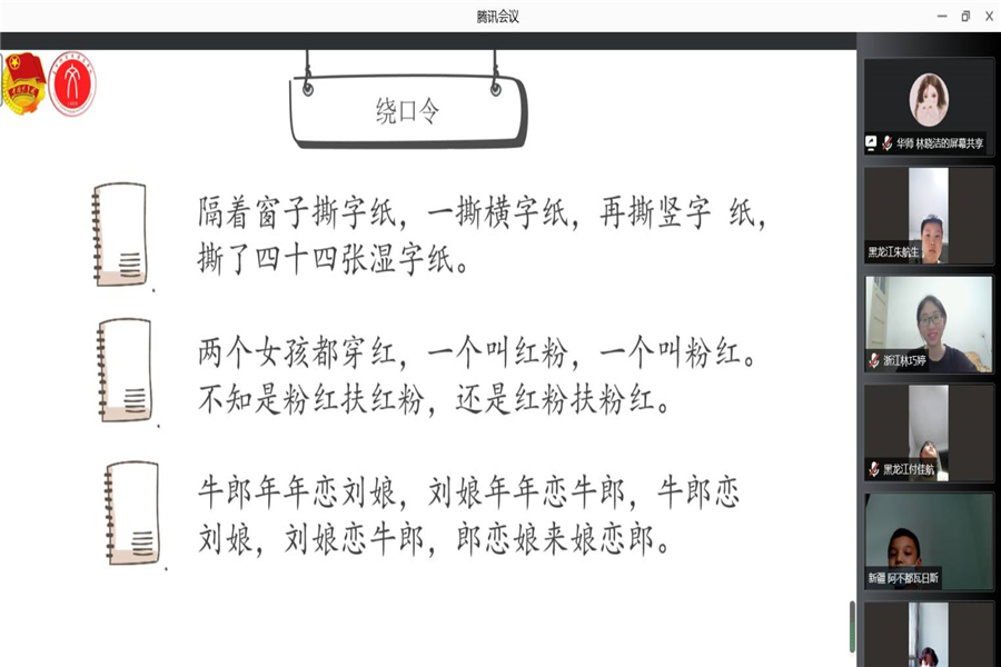 次日上午,绕口令大赛如期于腾讯会议举行。在星火实践队队长张艺卉清点参与人员数目后,队员齐瑞为大家简要介绍了本次绕口令比赛的流程与规则。根据规则,来自黑龙江、浙江和新疆三地的小朋友将按照各自抽签到的序号,依次进行绕口令表演。
