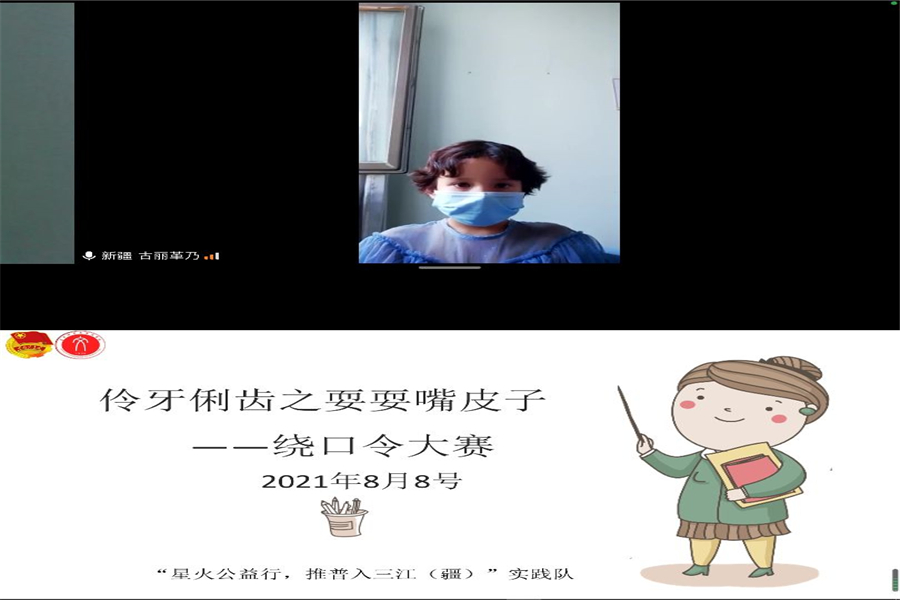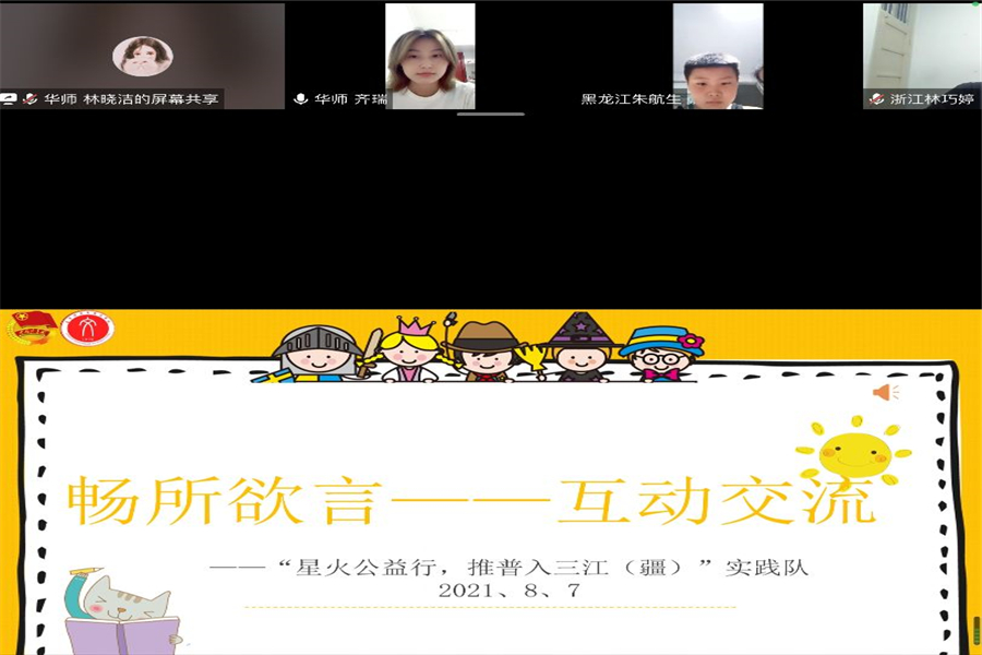华大青年讯 (通讯员 吴鸿仪)8月7日上午,由“星火公益行,推普入三江(疆)”实践队 (以下简称“星火实践队”)举办的普通话知识推广夏令营于线上准时开展。星火实践队队长张艺卉清点参与人员数目,最终确定有来自黑龙江、浙江的小学生各2名、来自新疆的小学生5名以及星火实践队队员3名。大家通过腾讯会议向同伴、老师问好。