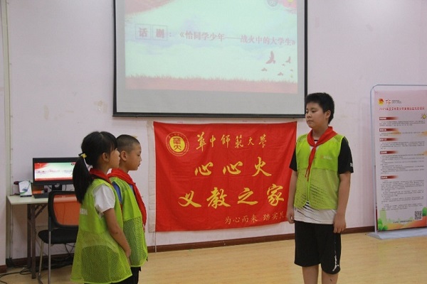 7月30日,实践队联合蔡甸区白鹤泉青少年空间、龙王庙社区青少年空间举办了“演绎红色话剧,庆祝百年华诞”红色话剧展演系列活动。实践队的老师们利用课余时间不断加强对学生们的普通话训练,充分考虑学生实际,与学生共同修改、确定话剧剧本,并经过层层筛选确定了参与人员。话剧展演以抗日战争为主要背景,讲述了西南联大学生英勇投入抗战的故事,塑造了一批光辉先进的爱国学生,赞颂了他们的爱国热情。