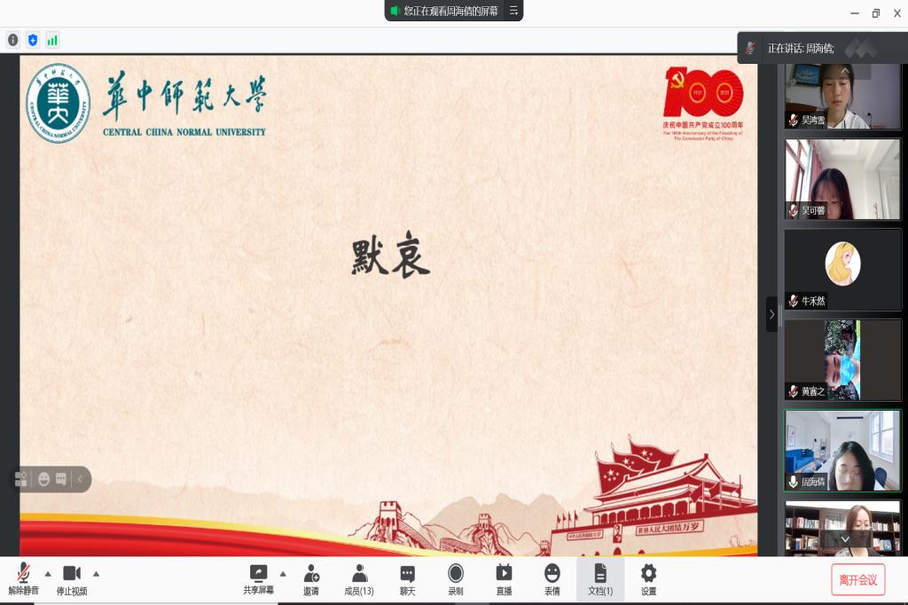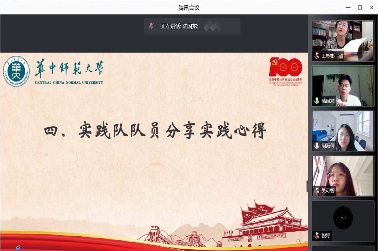 华大青年讯(通讯员 祝婷)8月27日,华中师范大学学生会(以下简称“华大学生会”)优秀学生骨干暑期社会实践队于线上开展红色展馆参观活动,本次活动旨在激励实践队队员缅怀革命先烈,汲取革命先辈们的精神力量,传承红色基因,感悟初心使命。