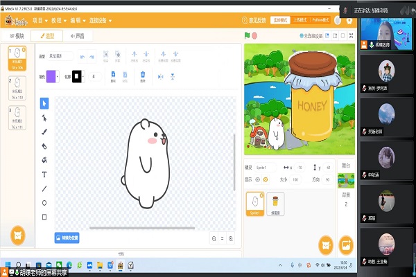 考虑到小学六年级的学生并不了解相关的编程指令,实践队选用“Mind+”图形化编程软件,将不可见的计算机处理过程转化为可见的动画形象“米乐熊”的变化。课程开始之前,实践队成员向学生简单介绍了本次支教的计划和安排,并提前发布资料,让学生提前了解编程工具,熟悉课程内容。6月24日,图形化编程课正式拉开序幕。成员们借助卡通形象“米乐熊”展开教学,以米乐熊的移动、跳跃和奔跑等活动,讲解简单的编程指令的含义。学生在成员们的指导和帮助下,选择不同的语句,帮助米乐熊成功过桥,实现教学目标。