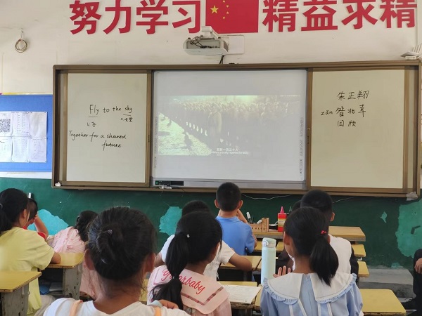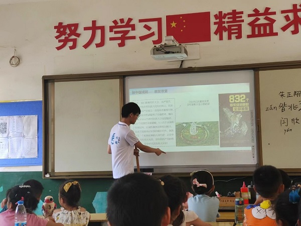 在课堂学习过程中,志愿者首先进行国家知识科普并介绍祖国发展取得的伟大成就,让同学们对我们的祖国有更深的了解,激发同学们的民族自豪感。课堂上,同学们积极发言,纷纷表示为自己生于中国而感到自豪和骄傲,志愿者也激励他们追求自己的梦想,做高举爱国主义伟大旗帜的新时代好少年。