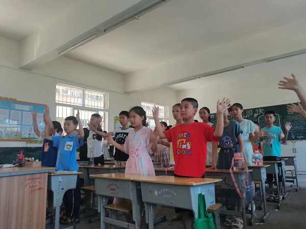 华大青年讯(通讯员 昝兆幸)为深入贯彻习近平总书记在中国共产党第十九次全国代表大会上提出的关于爱国主义教育的精神,广泛开展理想信念教育,深化中国特色社会主义和中国梦宣传教育,弘扬民族精神和时代精神,六月二十九日及六月三十日上午,华中师范大学经济与工商管理学院鸿鹄志愿服务队在随县唐县镇第二小学开展“七彩假期”暑期课堂第一课——爱国主题教育。通过共唱国歌、志愿者讲述、学习爱国舞蹈、观看爱国电影等方式,志愿者为学生们普及国家相关知识,增强学生民族自豪感,培养学生爱国情怀。