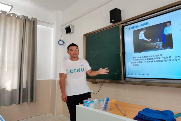 课前,队员张佳文为学生讲解了机器人的发展历史、应用领域以及发展前景。课堂上,张佳文通过举例,介绍了机器人领域的相关知识。学生认真听讲,提出疑问,实践队成员对学生们的疑问做出解答。通过张佳文对华中师范大学机器人协会的相关情况与现有成果的介绍,以及实践队机器人进行的表演展示,学生近距离地感受到了机器人的运动方式。