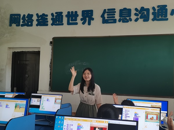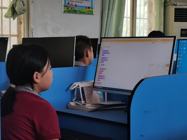华大青年讯(通讯员 贾钰婕)7月1日,人工智能教育学部科创实践队(以下简称“科创实践队”)为提高当地学生信息素养,激发他们对编程的兴趣,促进乡村振兴、城乡教育均衡发展,在三里小学进一步开展图形化编程创作、“慧乐编”卡牌等编程类课程。