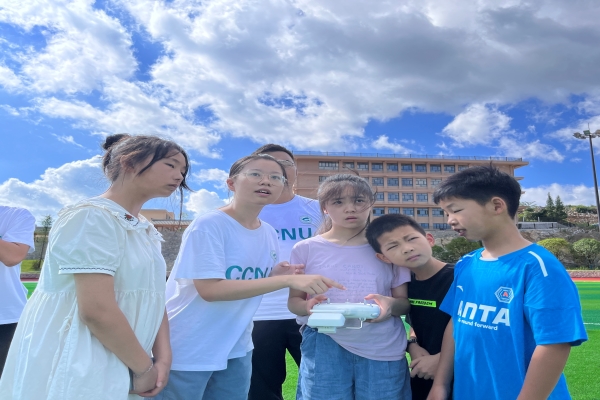 操场上,实践队成员向学生们讲解遥控器的开关方式以及如何对无人机进行方向控制,指导学生们操控无人机。学生王紫菡向队员们提问道:“我曾买过简易的无人机进行飞行操作,但无人机经常不能稳定地飞行。”在汤文双的指导下,王紫菡不仅在有风的环境下成功让无人机飞行起来,还学到了很多关于如何稳定无人机的技巧。