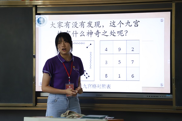 “奇妙幻方”课堂由实践队队员张贵婧讲解。张贵婧讲述解决幻方问题的简便方法,带领学生们进行实际运用。其余实践队队员走下讲台关注每一个学生的解题情况,致力于让每一个学生都有课堂参与感,能在课堂上有所收获。