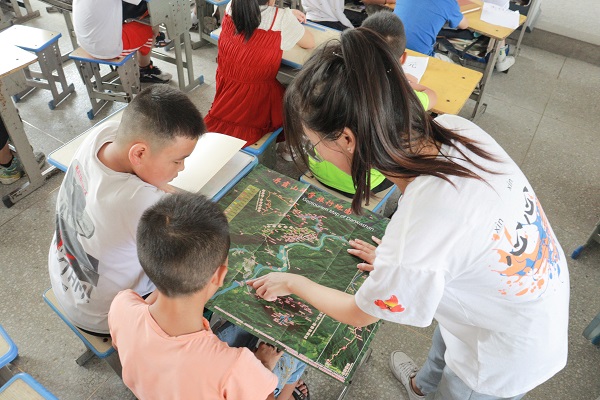 在十堰队队长刘燕萍的指导下,学生不仅沿着地图指示了解了丹霞地貌的分布情况,还用纸笔设计了保护丹霞地貌的创意海报。在绘画过程中,学生分别从个人、学校、政府角度出发,提出了“种植绿树”“向身边的人讲述保护自然地貌的重要性”以及“设立自然保护区”等保护措施。