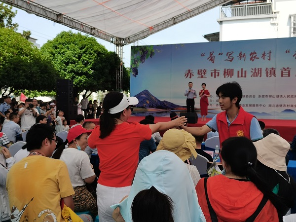 活动当天,实践队全体队员乘车于早上八点前抵达柳山湖镇易家堤村活动现场,队员们在工作人员的指导下进行准备工作。九点,全体队员就位,赤壁市柳山湖镇首届葡萄采摘节在歌舞中正式开始。本次采摘节主会场共设置了两个游戏环节,实践队队员屈祖一在活动中担任游戏引导员,主要负责在观众席将话筒传递给相应的游戏参与人员,同时向游戏参与者赠送礼品。屈祖一表示,在主会场的引导工作,一方面需要正确理解主持人的指示、及时反应,另一方面要及时传递话筒、不耽误采摘节的进程。